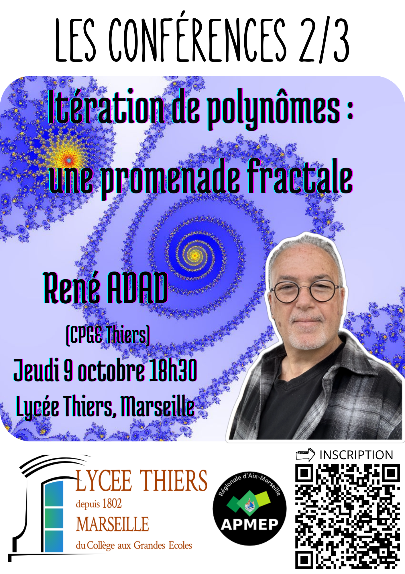 Elle sera animée par René ADAD (lycée Thiers), en voici le titre : ""Itération de polynômes : une promenade fractale"". Ci-dessous un résumé de l'exposé et du parcours de l'intervenant. La conférence s'adresse à tout public curieux en mathématiques.