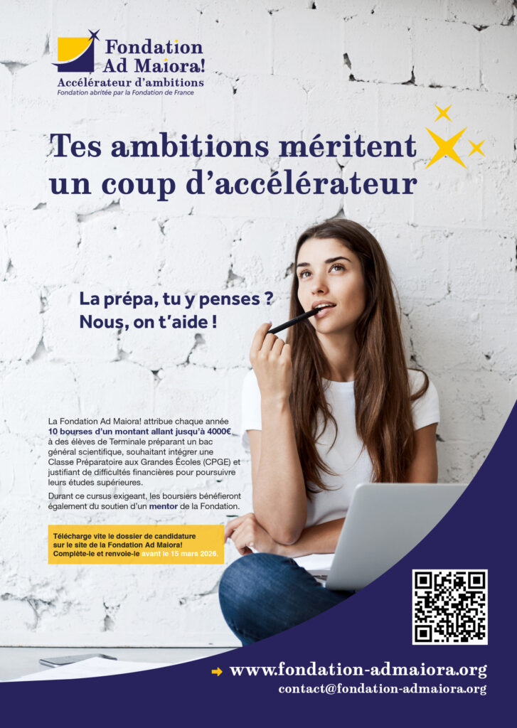 La Fondation Ad Maiora! attribue chaque année 10 bourses d’un montant pouvant aller jusqu’à 4000 € à des lycéens résidant en Auvergne Rhône Alpes ou Bourgogne Franche Comté, entrant en classes préparatoires scientifiques afin qu’ils puissent poursuivre leurs études dans les meilleures conditions.